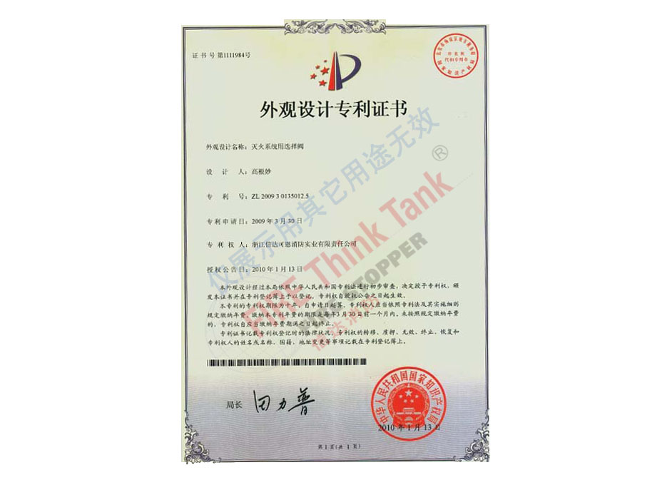 • 滅火系統(tǒng)用選擇閥外觀專利