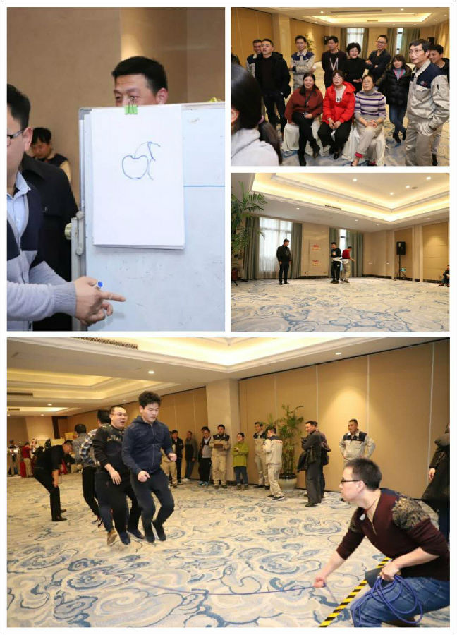中午酒店內(nèi)簡易自助餐后,下午13:30的游戲環(huán)節(jié)準(zhǔn)時開場。只見游戲現(xiàn)場笑聲連連,有跑男中的轉(zhuǎn)布條游戲、你畫我猜,擲沙包……等等,大家在游戲當(dāng)中,既放松了心情,又收獲了友情。尤其是轉(zhuǎn)布條游戲,只見一個個被轉(zhuǎn)的暈頭轉(zhuǎn)向找不著北時,還在不遺余力地往前奔跑,只為給系統(tǒng)爭當(dāng)?shù)谝弧!澳惝嬑也隆庇螒?,讓大家覺得畫到用時方恨平時練的少啊。最后一個集體跳繩環(huán)節(jié),3分鐘的跳長繩,不但考驗(yàn)大家的團(tuán)隊(duì)配合能力,也在考驗(yàn)著大家的體力。
