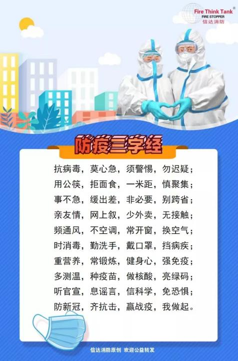 信達消防每日還通過企業(yè)微信向員工宣傳疫情防控知識,通報最新疫情風(fēng)險區(qū)域,發(fā)布《防疫三字經(jīng)》,引導(dǎo)員工接種疫苗,強化員工個人防護意識。