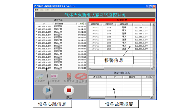 系統(tǒng)箱體控制面板由液晶屏、按鍵、指示燈組成。液晶屏實(shí)時(shí)顯示各連接瓶組狀態(tài),假如瓶組發(fā)生泄露或者瓶組噴發(fā)、壓力開(kāi)關(guān)損壞,液晶屏將顯示相應(yīng)信息??赏ㄟ^(guò)按鍵設(shè)置系統(tǒng)時(shí)間,設(shè)備編號(hào)等信息。上位機(jī)操作界面由通訊狀態(tài)、報(bào)警信息、通訊錯(cuò)誤信息組成。遠(yuǎn)程監(jiān)控系統(tǒng)將定時(shí)向消控中心PC機(jī)發(fā)送設(shè)備聯(lián)絡(luò)信號(hào),該信號(hào)在通訊狀態(tài)欄顯示;如果設(shè)備故障或網(wǎng)絡(luò)中斷,通訊錯(cuò)誤信息將會(huì)提示。報(bào)警信息欄顯示遠(yuǎn)程瓶組狀態(tài),信息包括時(shí)間、地址、瓶組編號(hào)、緊急聯(lián)絡(luò)人等。